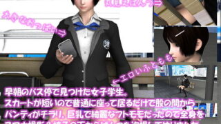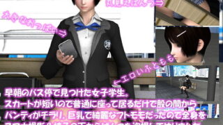 3DCG d_188359|早朝のバス停で見つけた女子学生。スカートが短いので普通に座って居るだけで股の間からパンティがチラリ。巨乳で綺麗なフトモモだったので全身をスマホ撮影&椅子の下からぱんつを盗撮してやりました(PV:青いストライプ柄パンティ編)